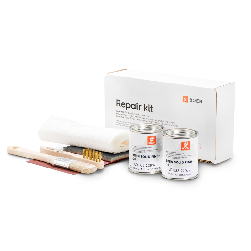 Pakavimas: taisymo instrukcija, šlifavimo popierius P 150, šlifavimo juosta P 360, 0,125 l BOEN Live Natural Oil, teptukas, valymo šluostės.